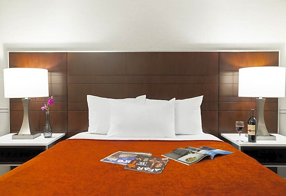 This room is located on the first floor and has a raised writing desk, lowered closet shelves, and touch lamps on the nightstands. The bathroom has a raised toilet seat, handrails around toilet and in bathtub, handheld shower head, extended vanity mirror, and a lowered towel rack.